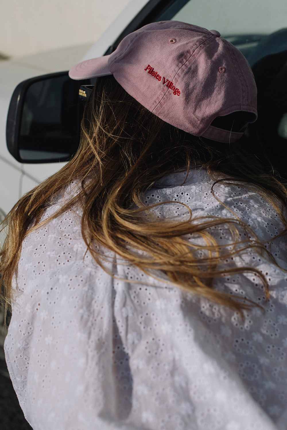 Vintage look, red SIMPLE LIFE embroidery on the front and red Pilates Village logo on the side.