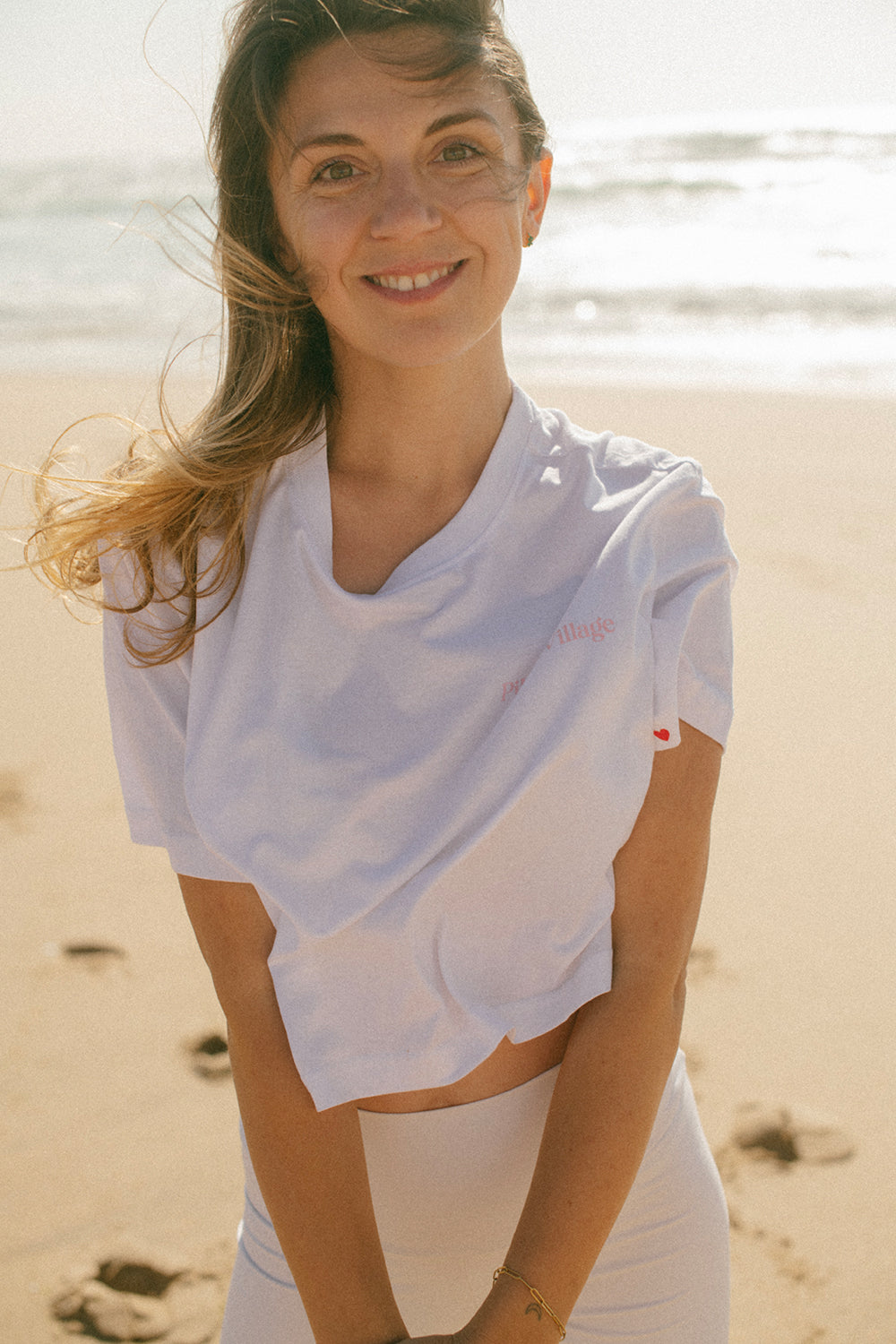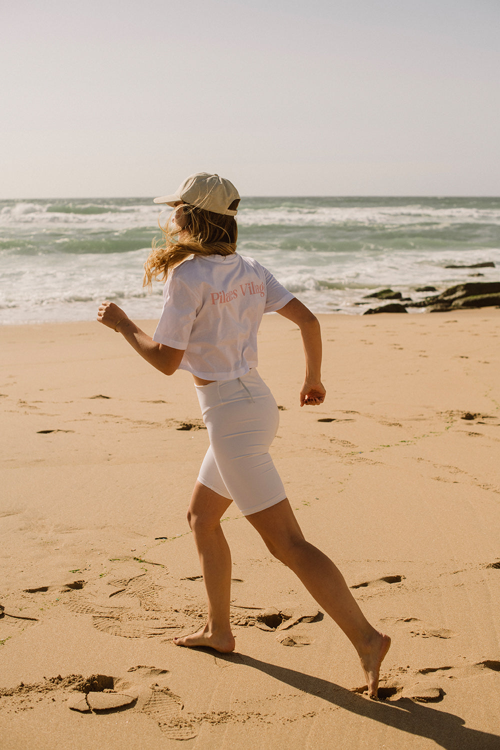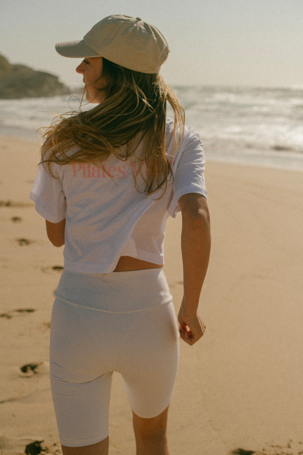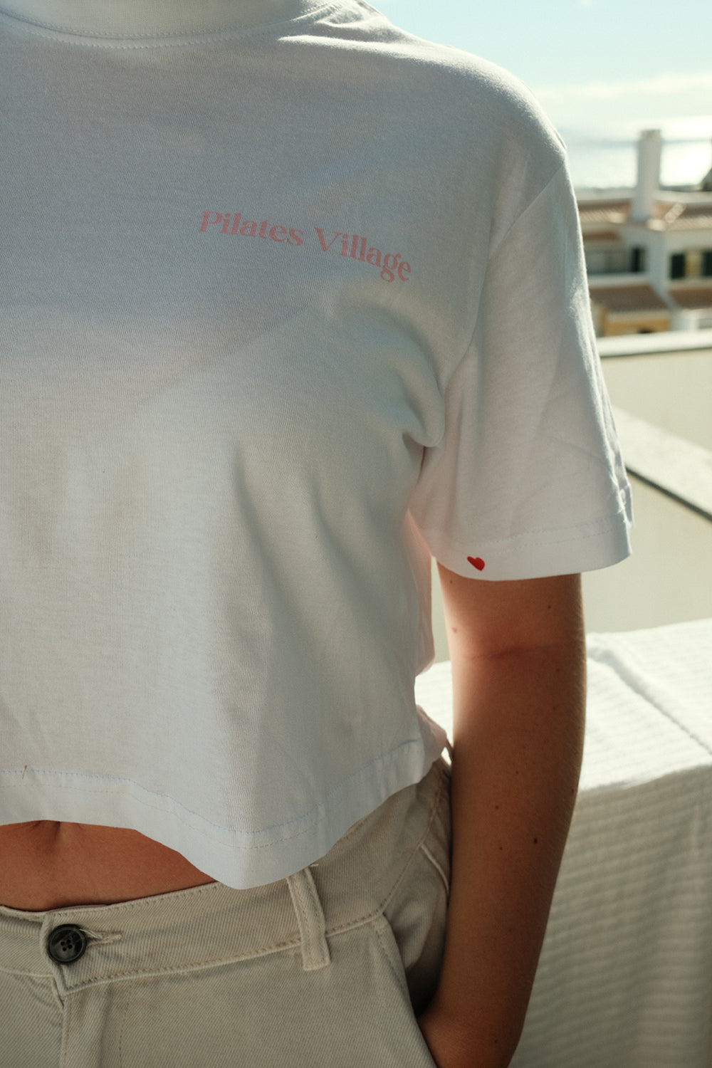 Cotton crop t-shirt in white with light pink Pilates Village logo on the front and back from the TASTE OF ENDLESS SUMMER collection. Ideal for sports and daily wear.