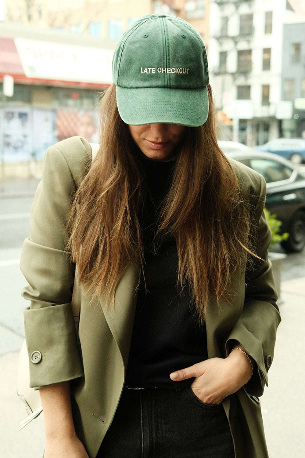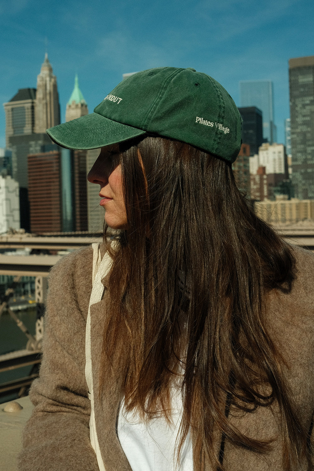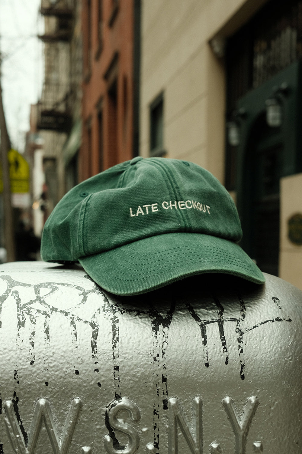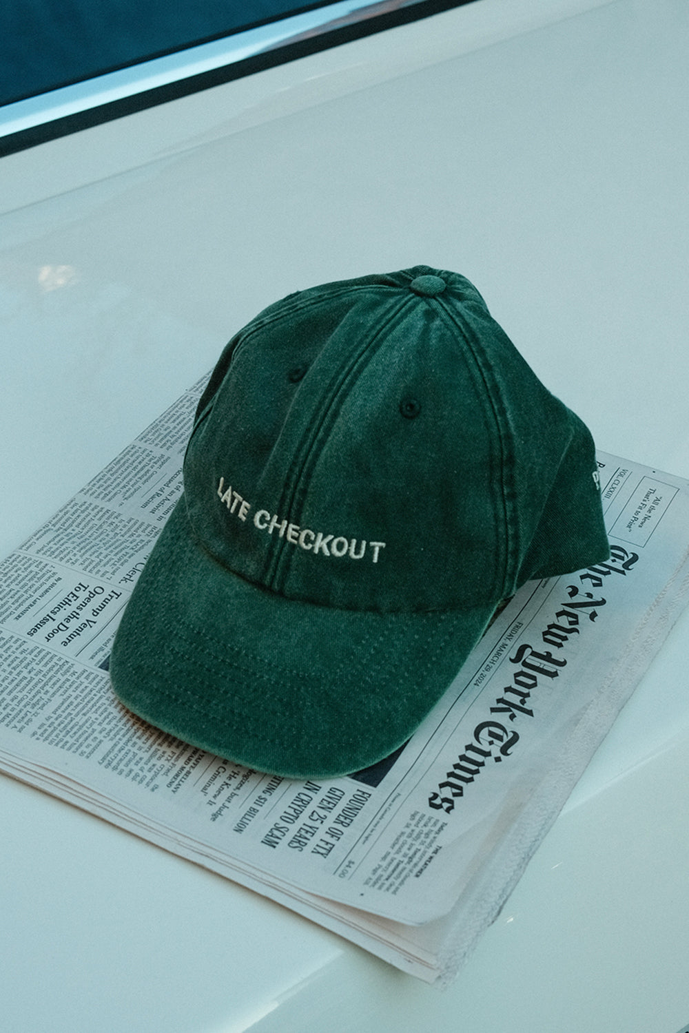 Featuring a vintage aesthetic, the cap showcases a cream-colored LATE CHECKOUT embroidery on the front, accompanied by the Pilates Village logo on the side.