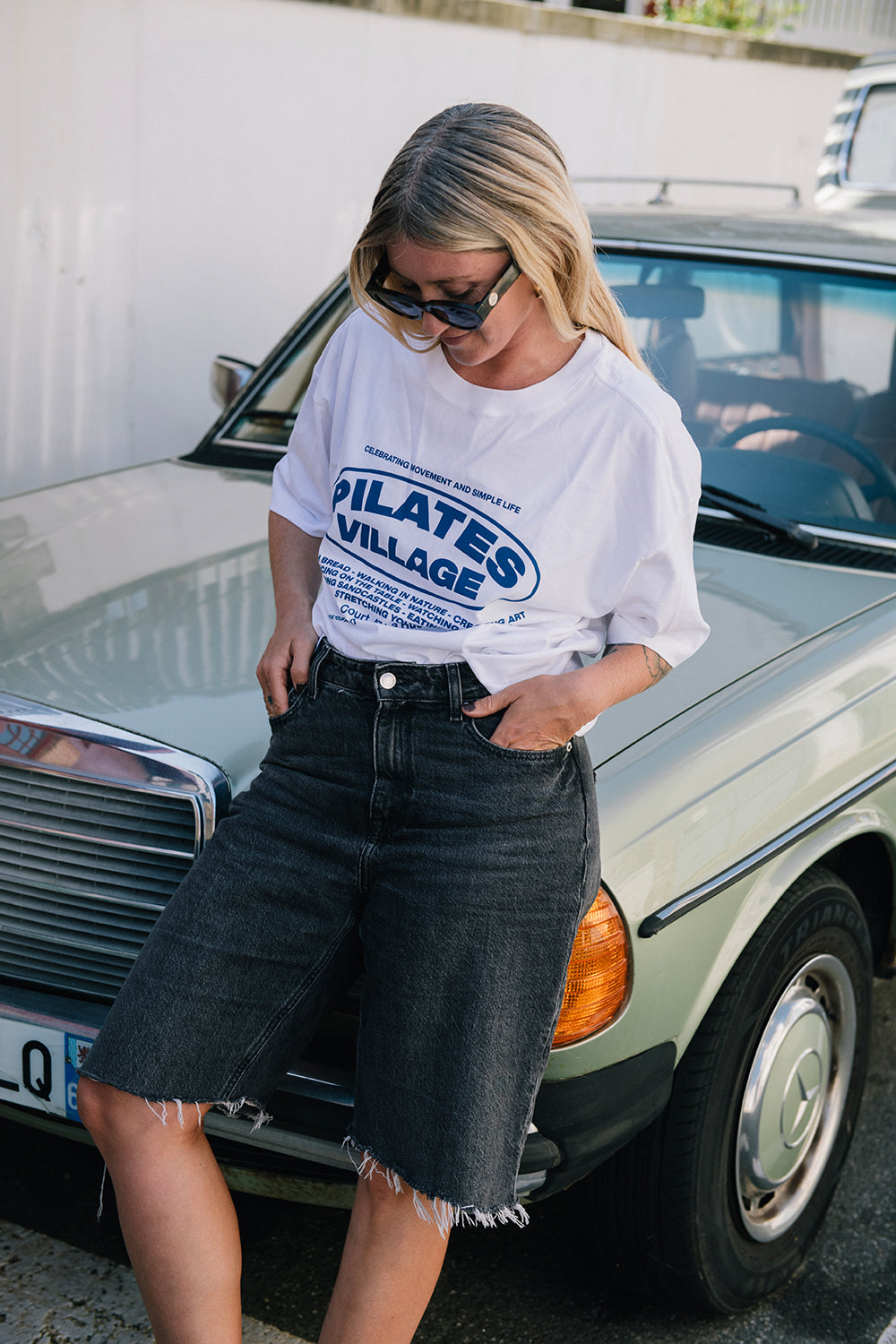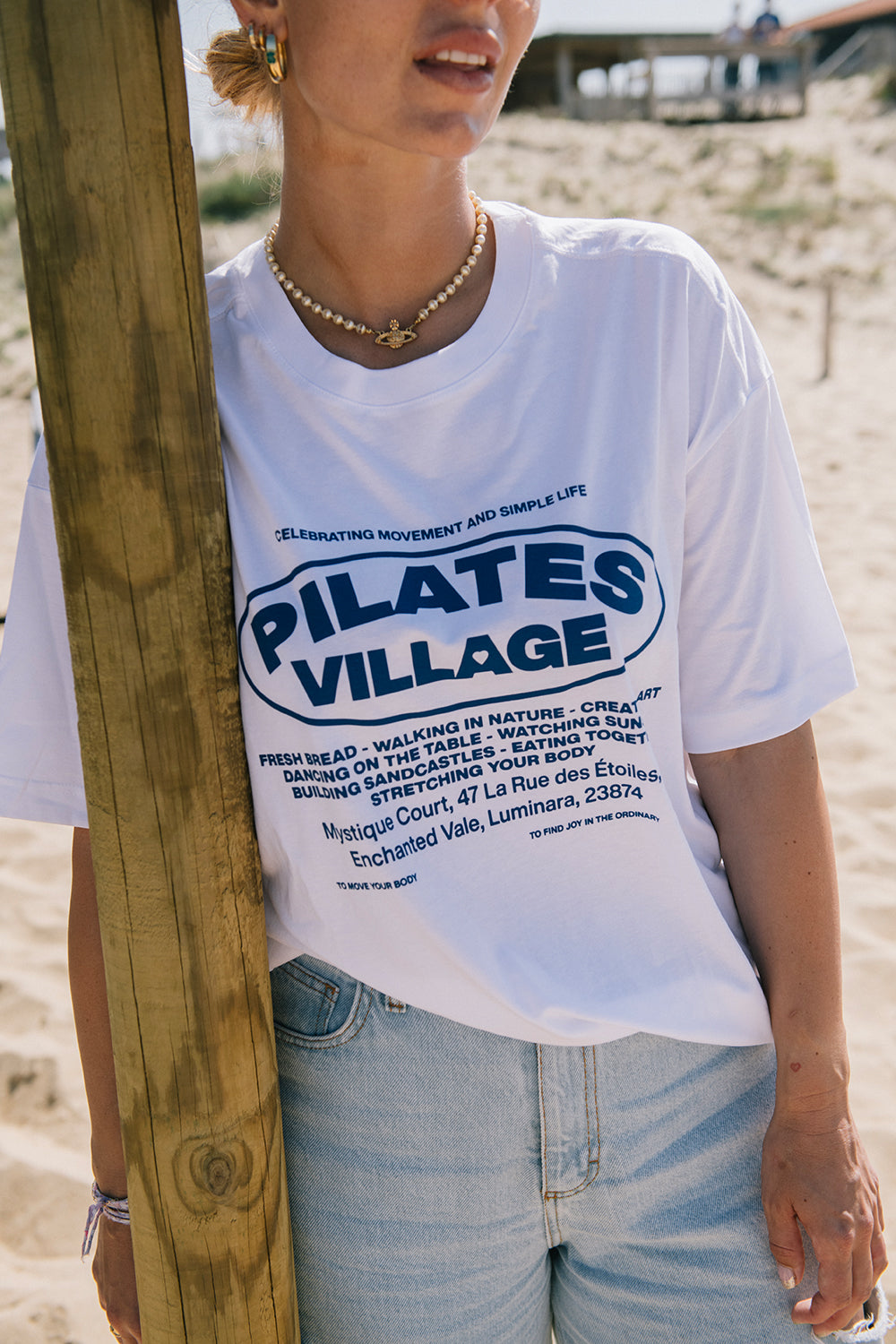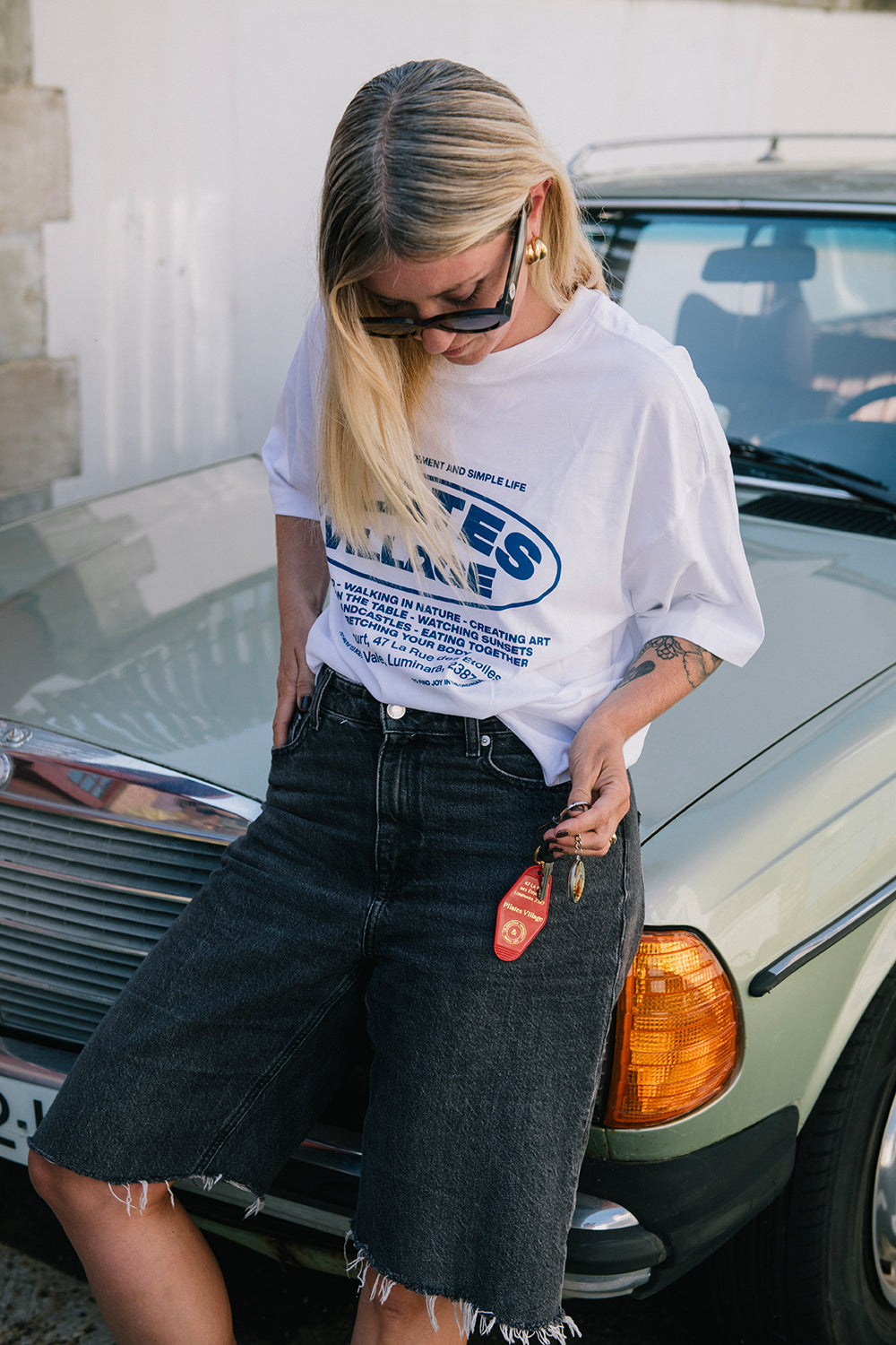 Cotton T-shirt in white color. Oversized cut. Blue print.